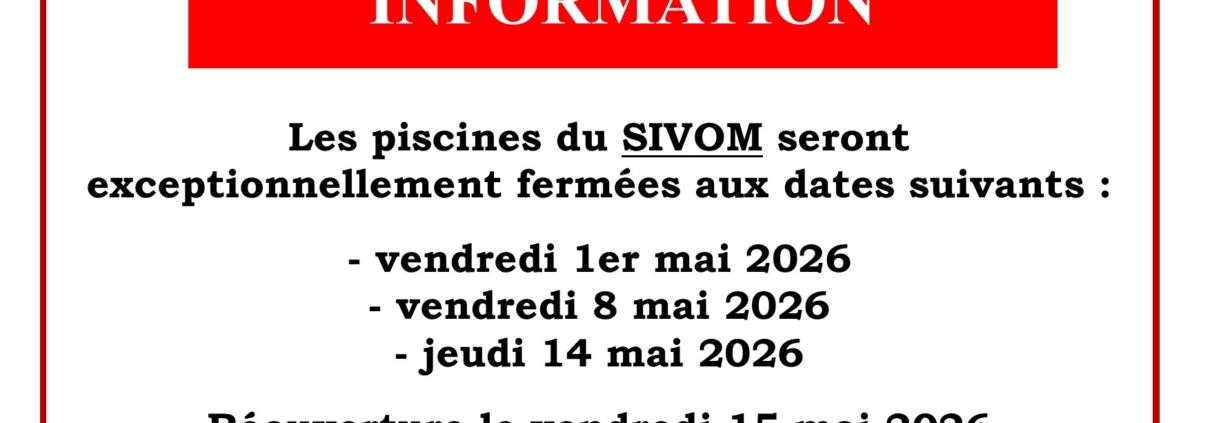 Fermetures piscines Actualité 14 avril 2026/par Jessica https://www.sivomdes3vallees.fr/wp-content/uploads/Fermeture-piscines-mai-2026.jpg 1240 1754 Jessica https://www.sivomdes3vallees.fr/wp-content/uploads/LOGO-SIVOM-3-VALLEES-300x212.png Jessica2026-04-14 12:04:102026-04-14 12:04:10Fermetures piscines